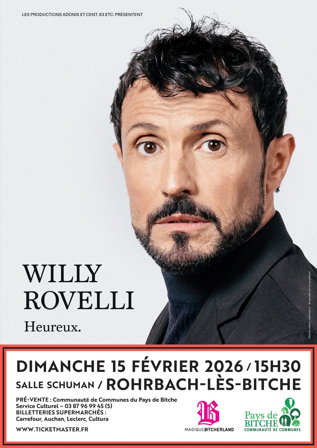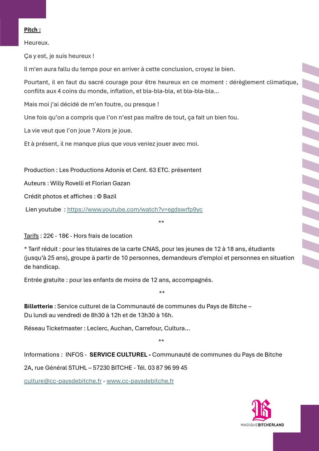 Service culturel de la Communauté de communes du Pays de Bitche et dans le réseau ticketmaster.fr (Supermarchés et en ligne)