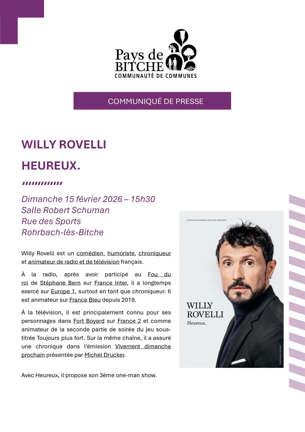 Après Fort Boyard et France Bleu, 𝗪𝗶𝗹𝗹𝘆 𝗥𝗼𝘃𝗲𝗹𝗹𝗶 sera à Rohrbach-lès-Bitche le dimanche 15 février à 15h30.